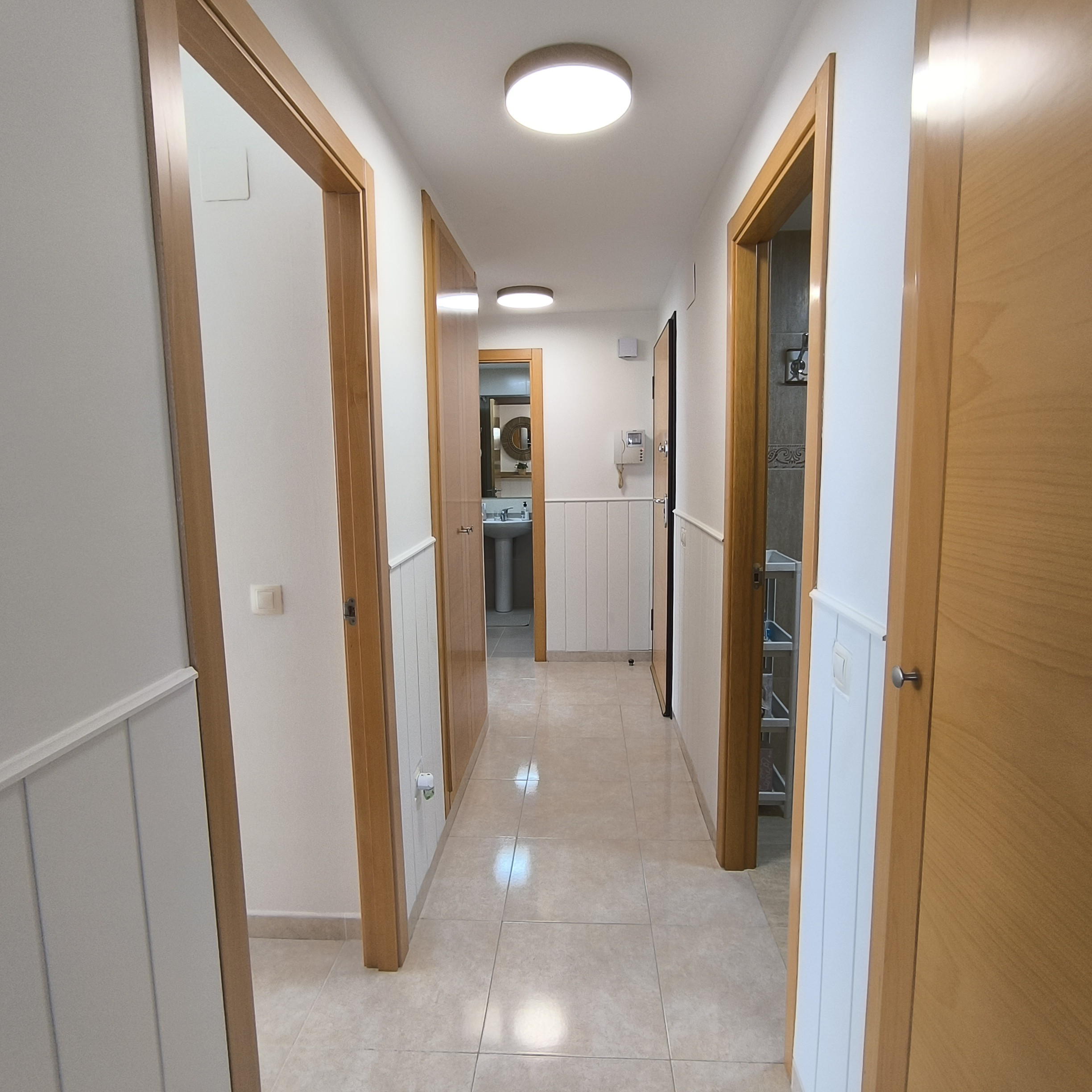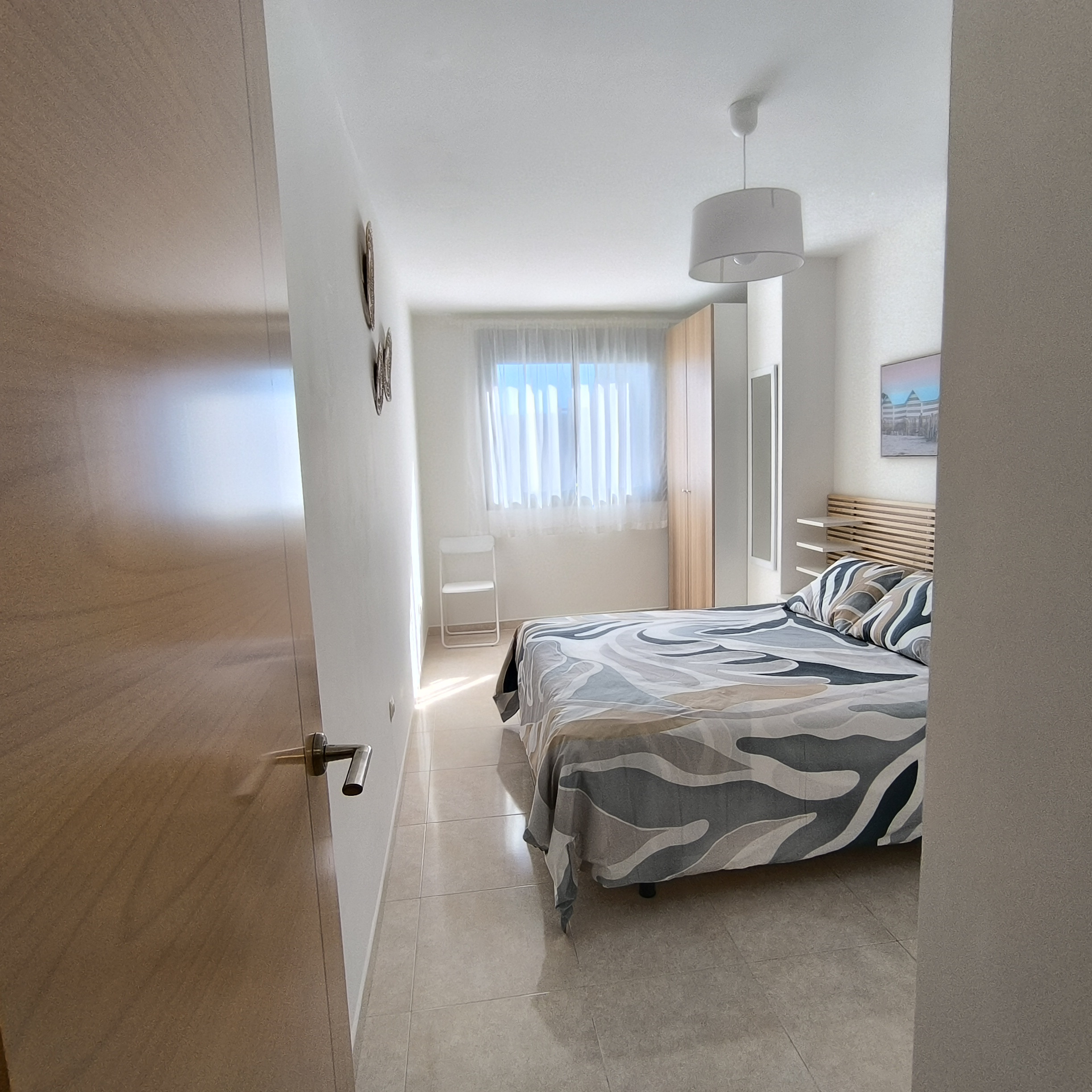 El apartamento cuenta con dos dormitorios que pueden acomodar hasta 5 personas, con una distribución de una cama doble y tres individuales. La luminosidad y el diseño interior crean un ambiente acogedor y funcional, perfecto para descansar después de un día de playa o turismo.