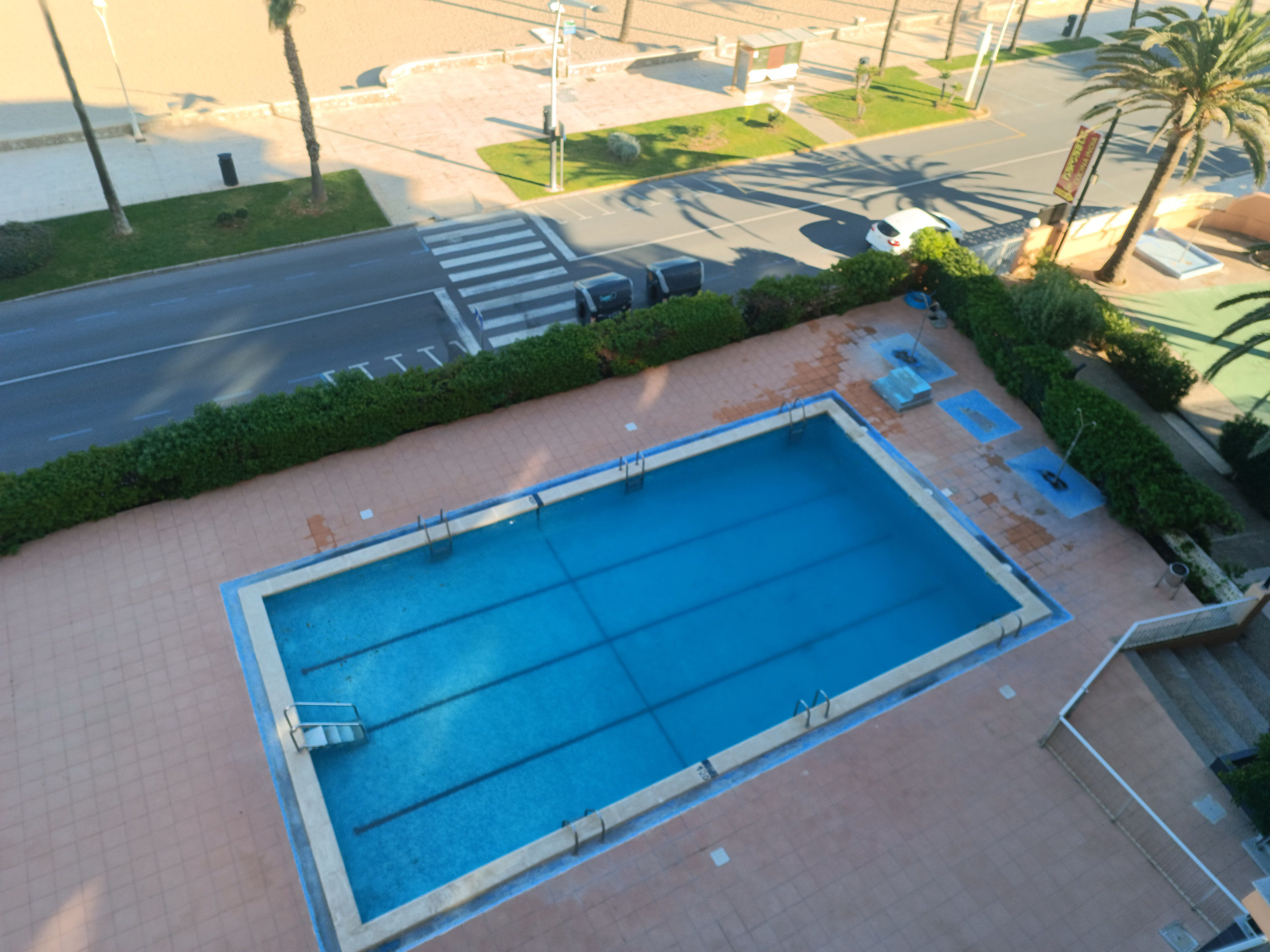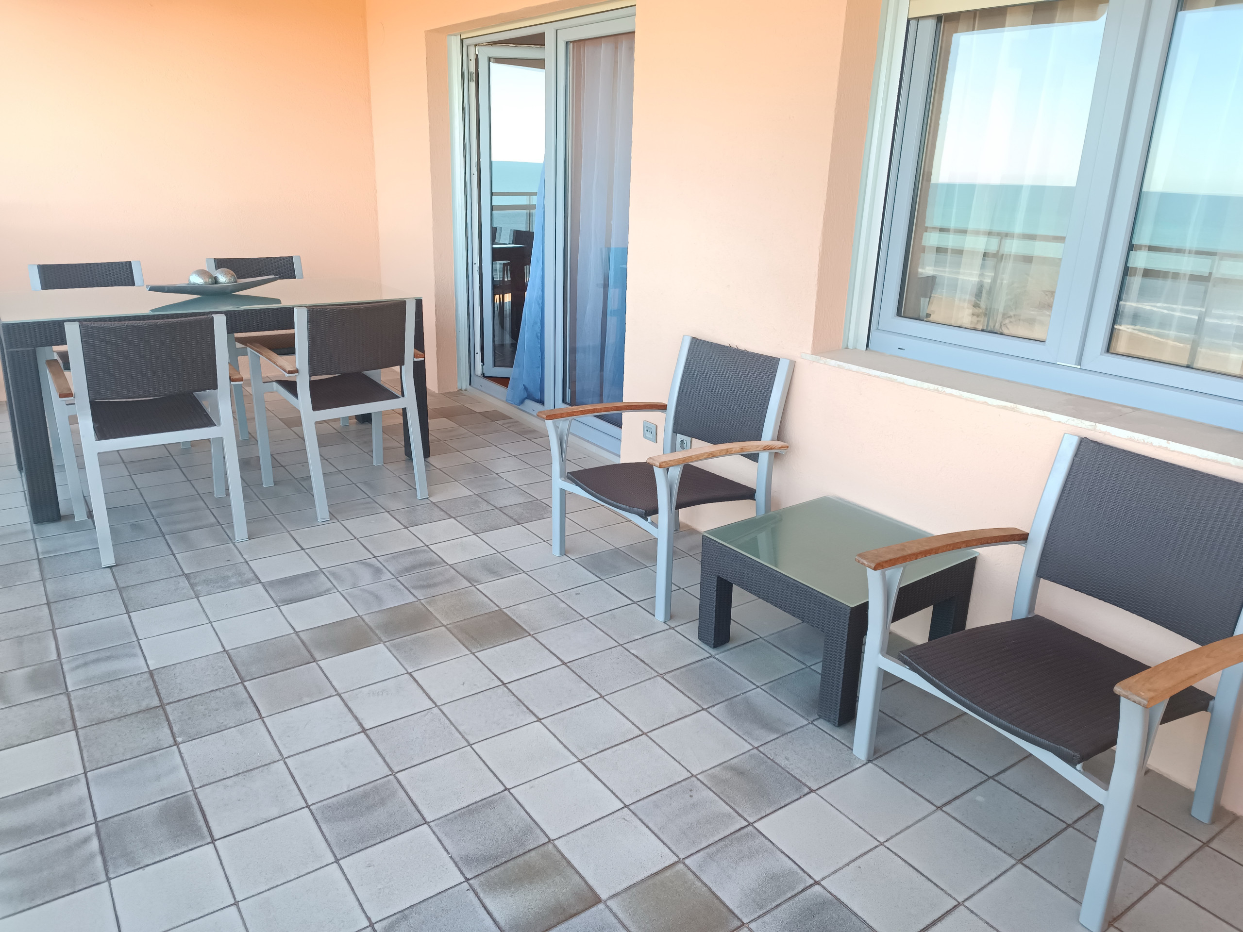 Logement de 95 m², situé en front de plage, avec vue sur la mer et la piscine.